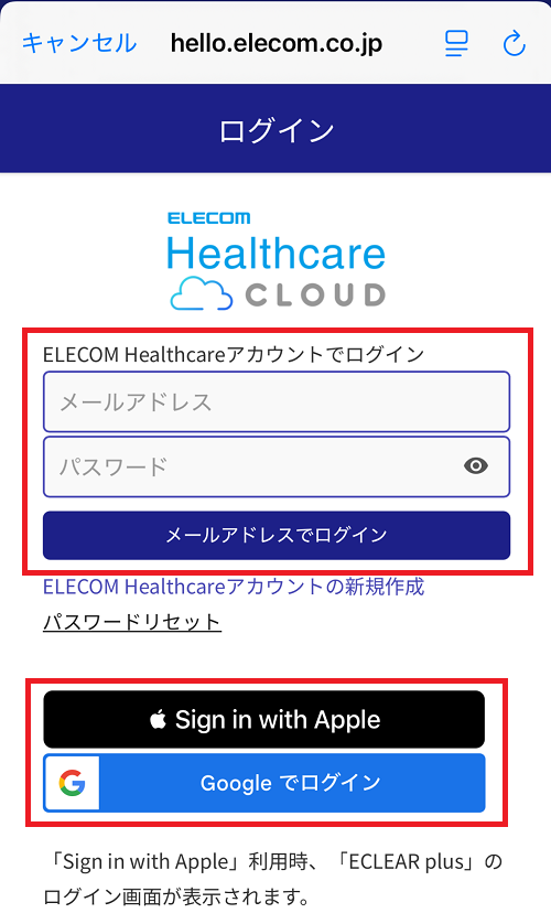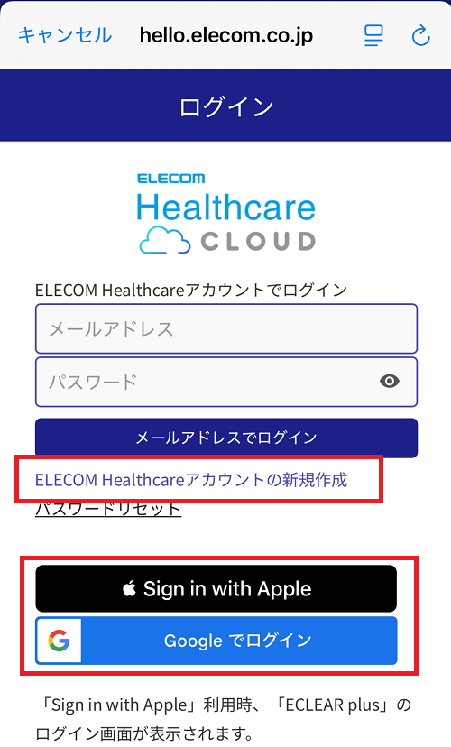 ELECOM Healthcare Cloud (旧HELLO!クラウド)にメールアドレス/Google/Appleのアカウントがある場合は、ECLEAR plus/ECLEARで行うことは何もありません。