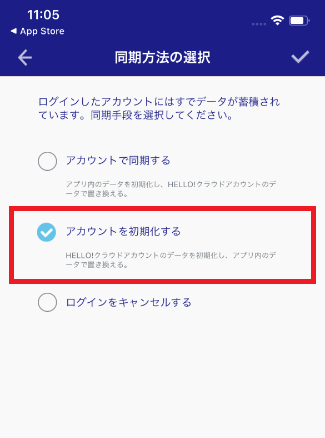 [同期方法の選択]にて、[アカウントを初期化する]を選択してください。※アプリ内のデータをサーバーへアップロードします。
