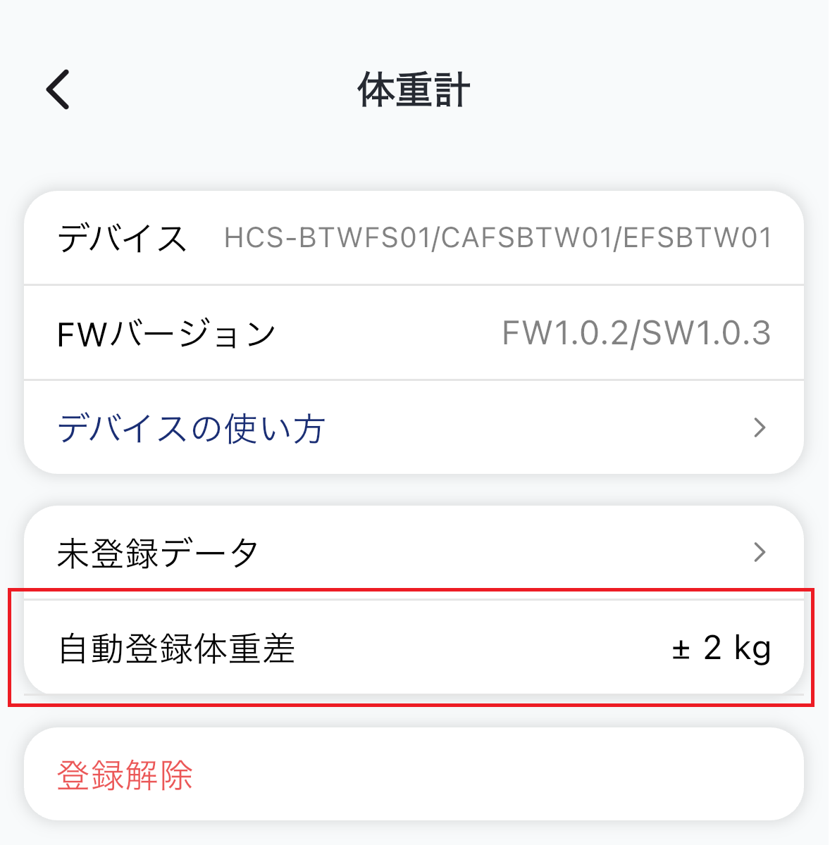 ・前回の計測値からの体重差が設定値(初期値:±2kg)を越えている場合は、自動登録は行われません。[アカウント]-[デバイス管理]-[HCS-BTWFS01/CAFSBTW01/EFSBTW01]の[未登録データ]にて、該当する測定値を手動で登録してください。