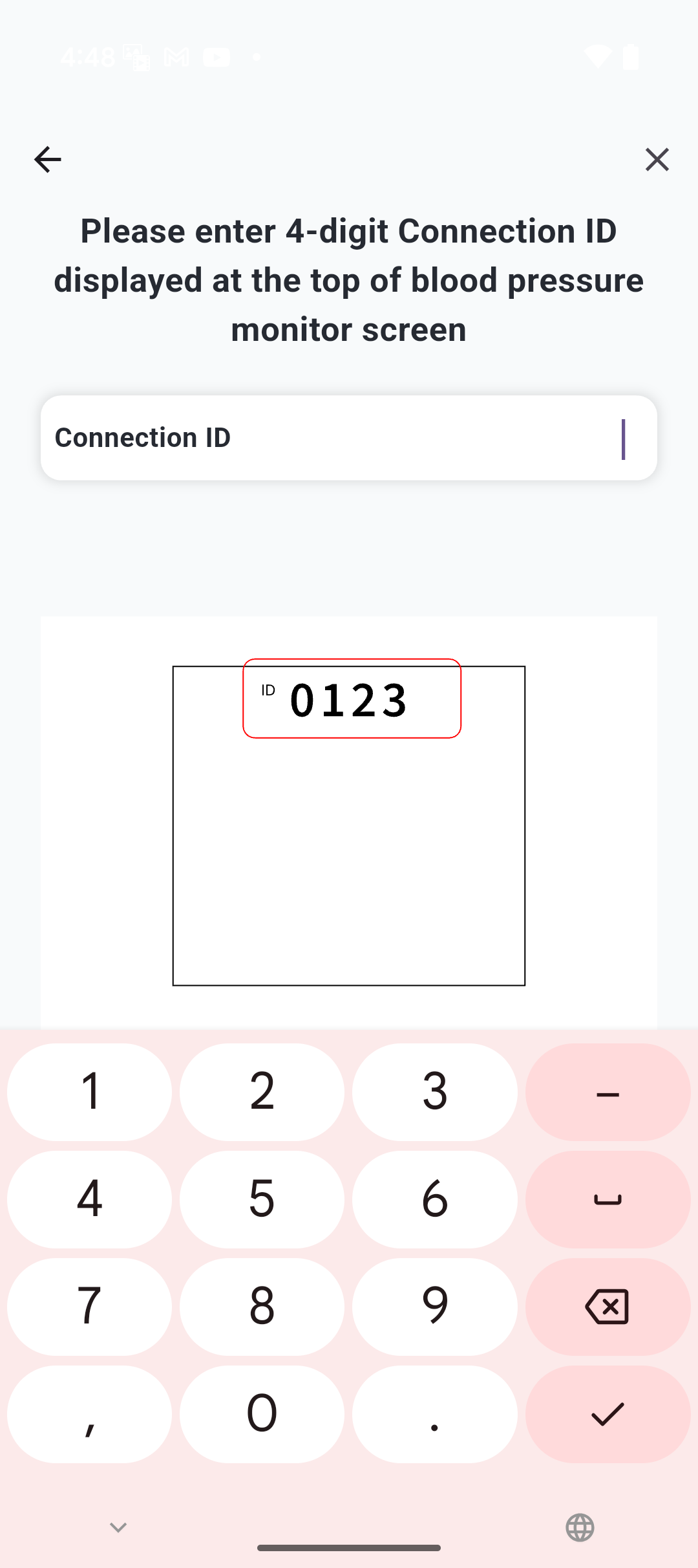 Enter the "Connection ID" displayed at the top of the blood pressure monitor screen and tap "Proceed".