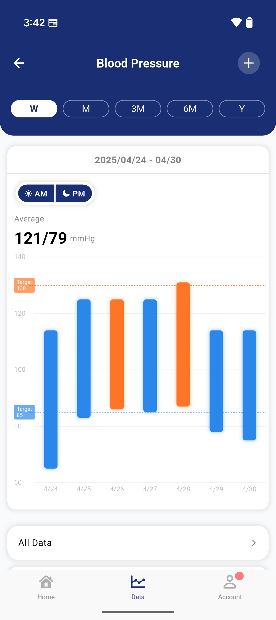 Visualize daily maximum and minimum blood pressure values in a graph. Display measurement values separately for morning and evening, useful for health management.