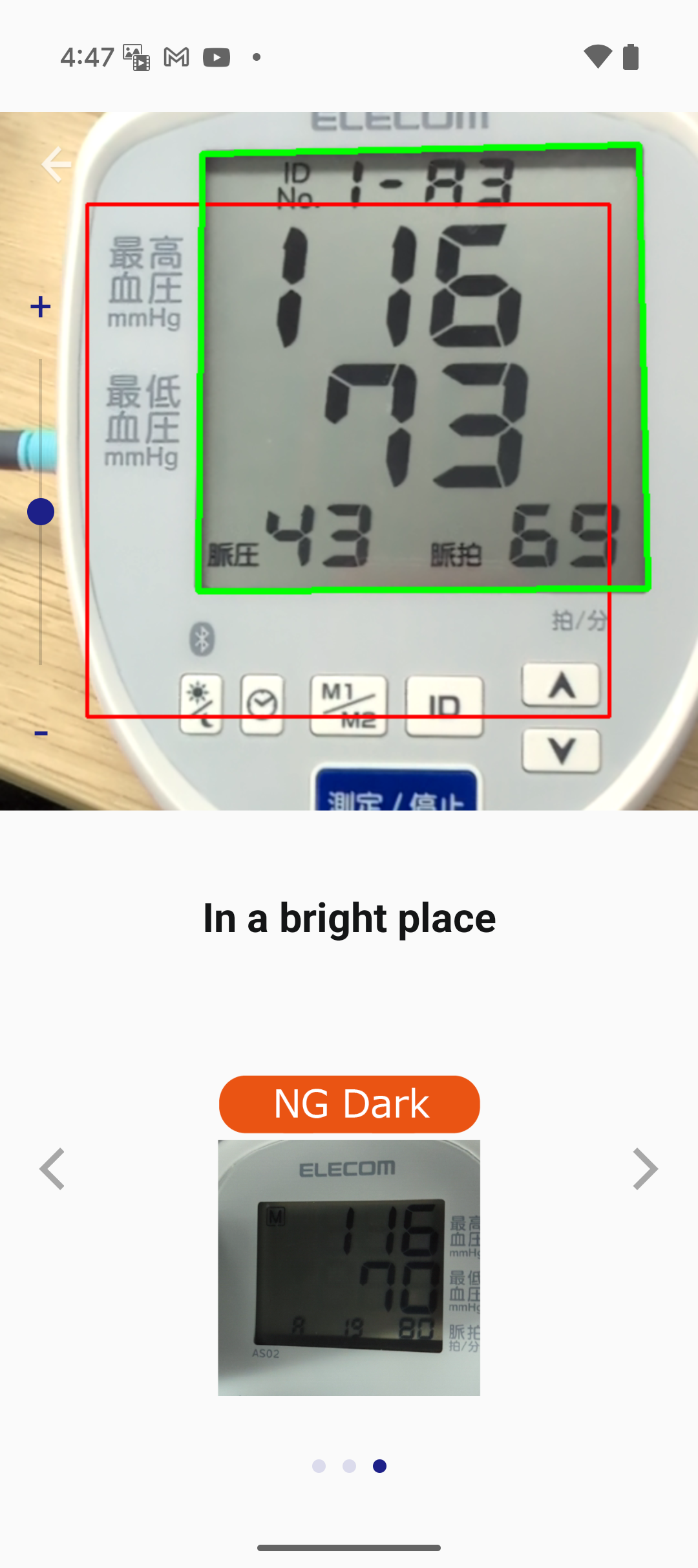 Move the smartphone or blood pressure monitor itself so that the measurement results fit within the red line area.