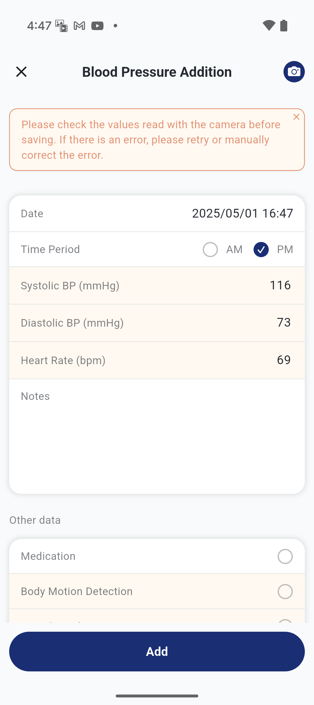 After measurement, select [Blood Pressure and Pulse from Camera] from the [+] button on the home screen.
