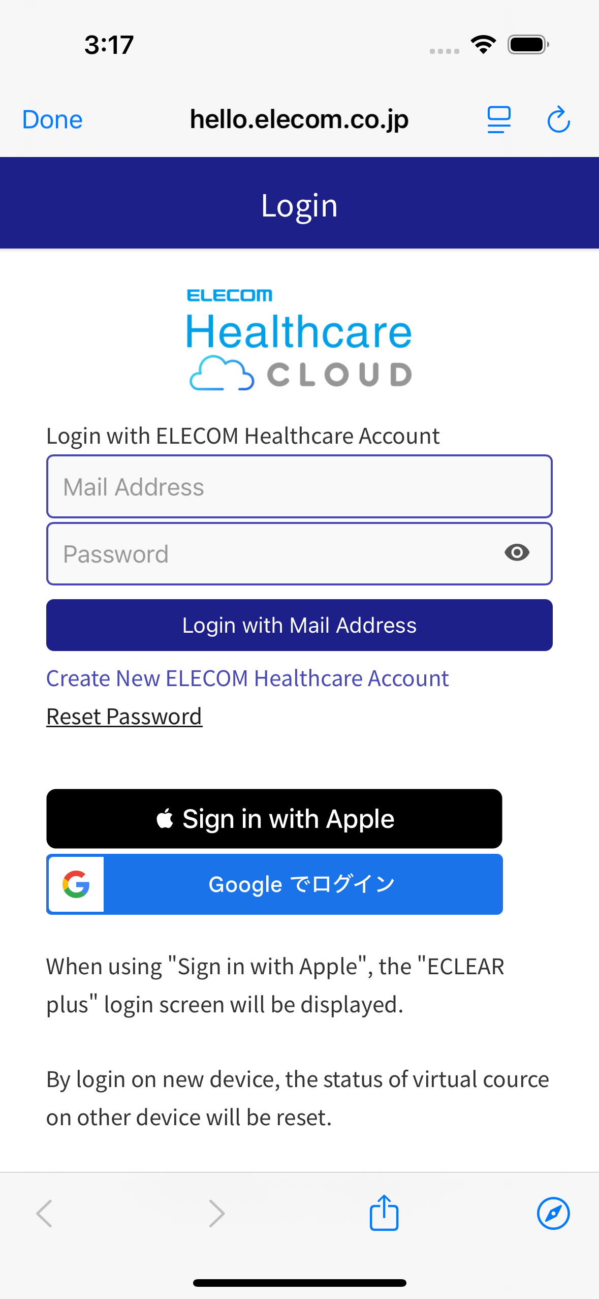 Log in to ELECOM Healthcare Cloud. If you do not have a Healthcare Cloud account, please do so from [New ELECOM Healthcare Account Registration] or use Google/Apple login.If login to ELECOM Healthcare Cloud is not required, select [Skip].
