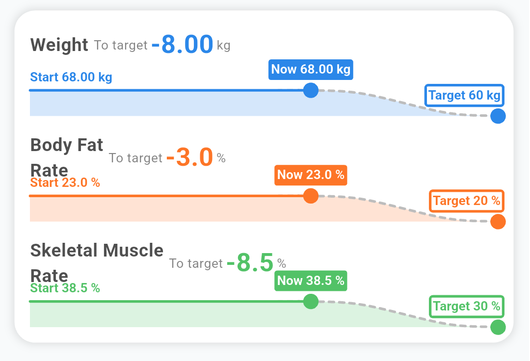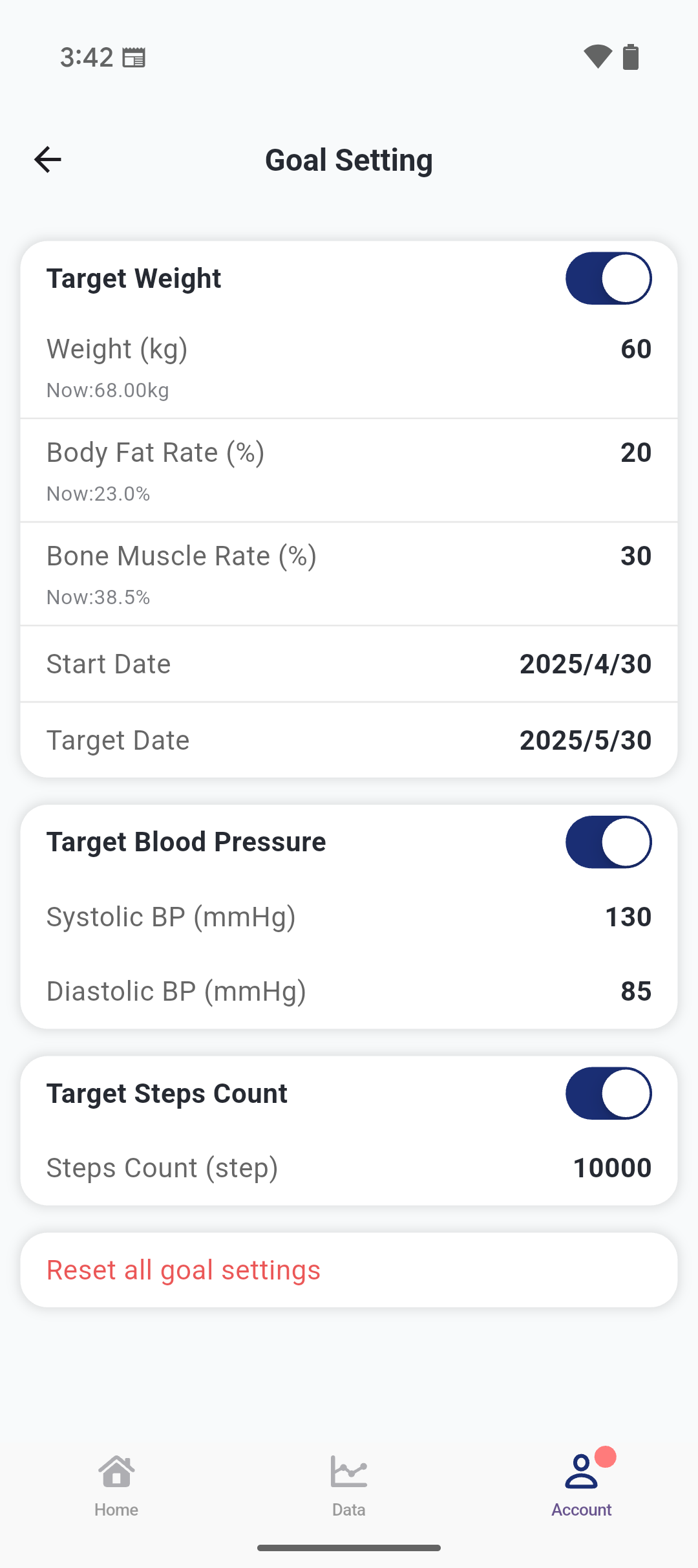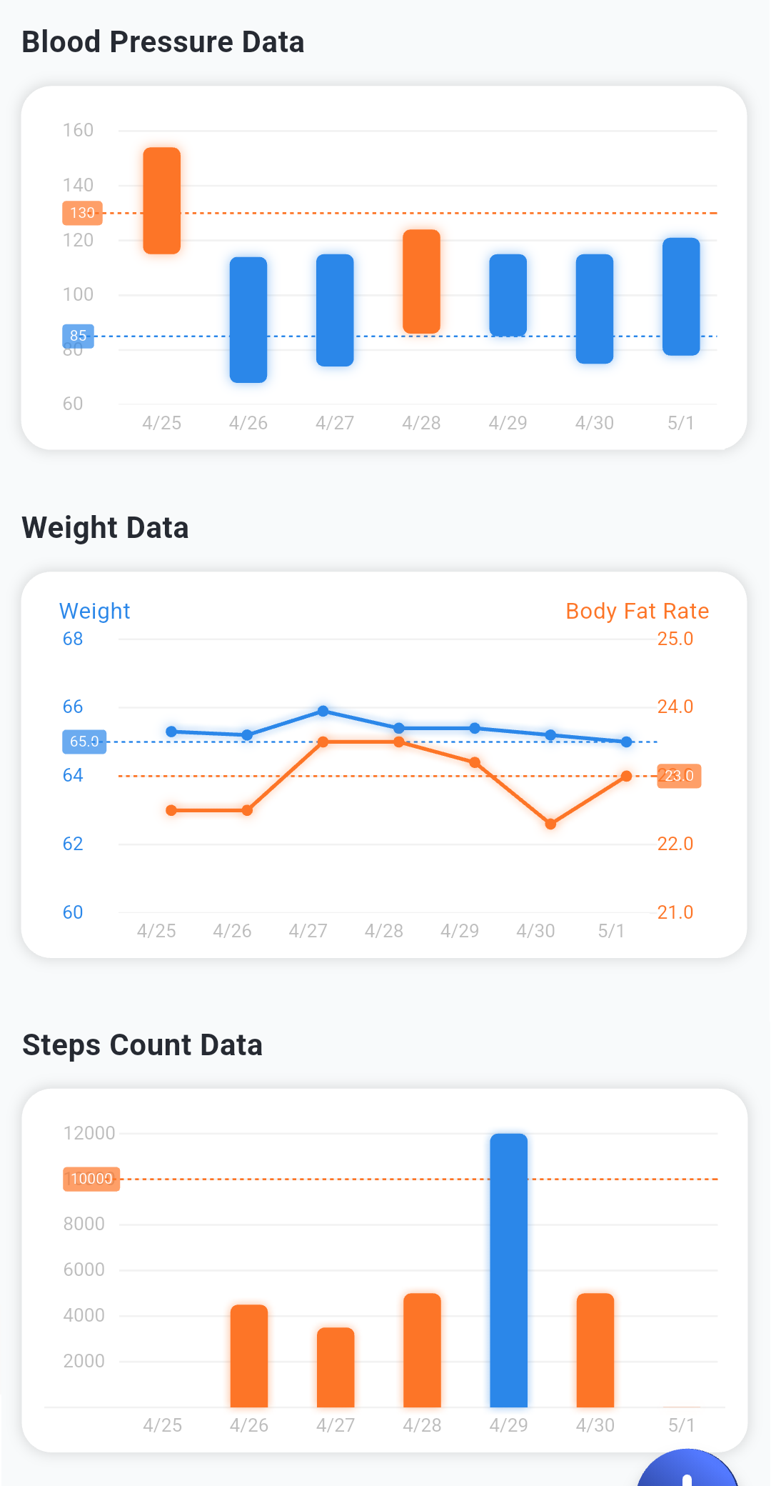 Set goals for blood pressure, step count, and weight. For weight, you can visualize the progress from the start date to the target date of the goal, helping maintain motivation.