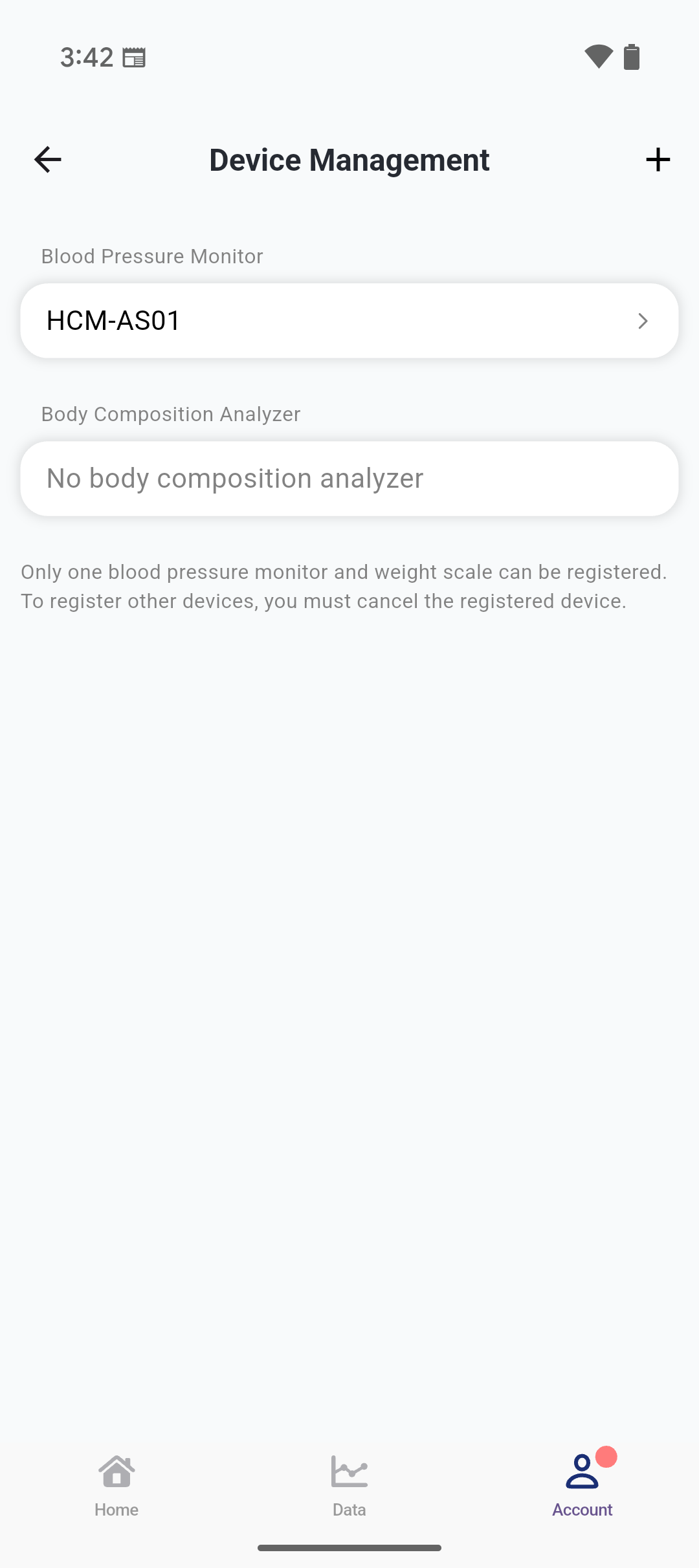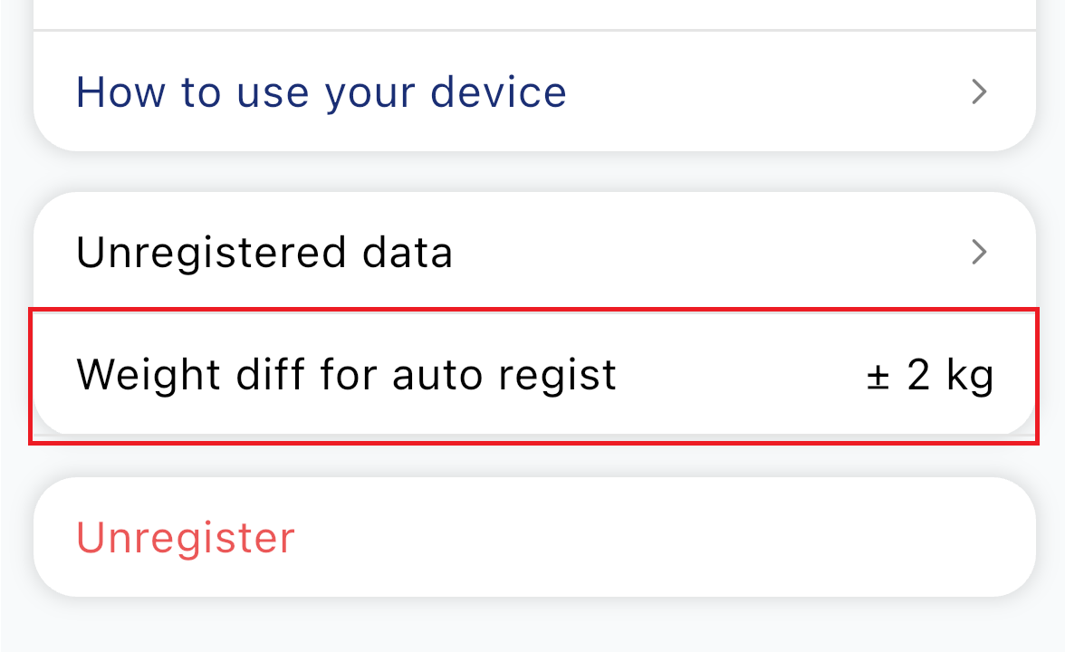 If the weight difference from the previous measurement exceeds the set value (default: ±2 kg), automatic registration will not be performed. Please register the corresponding measurement value manually at [Account] - [Device Management] - [Unregistered Data] in [HCS-BTWFS01/CAFSBTW01/EFSBTW01].