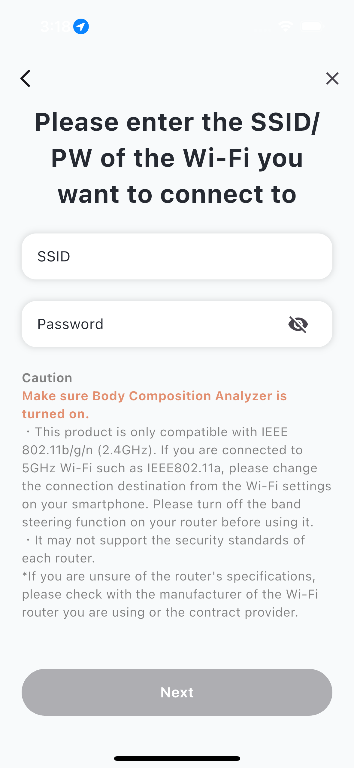 Set the SSID/PW of the router to which the Bluetooth/Wi-Fi body composition analyzer is connectedThe SSID will automatically display the one your smartphone is connected to, so please set only the PW.