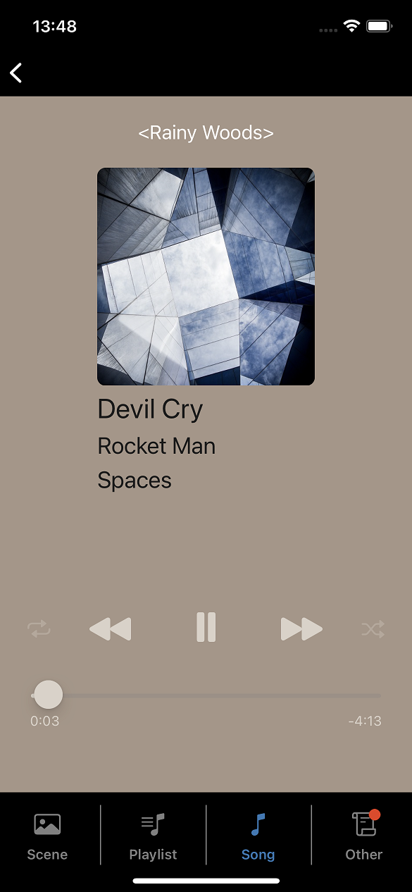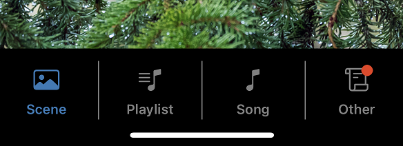 Scene"Scene" screen will be displayed.Playlist"Playlist" screen will be displayed.Song"Song List" screen will be displayed.Other"Other" screen will be displayed.
