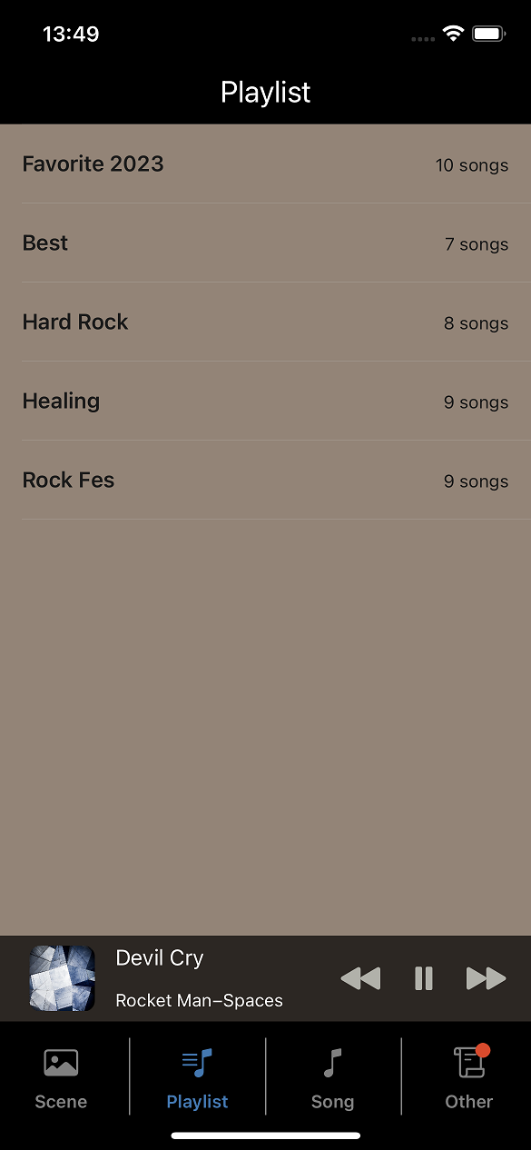 Playlist ListPlaylists in device are displayed. Tap any playlist to show song list in selected playlist.You can not create or edit the playlist in this app. Create or edit playlist in Apple music app. -