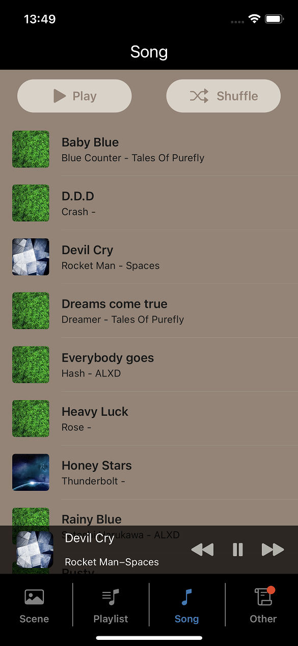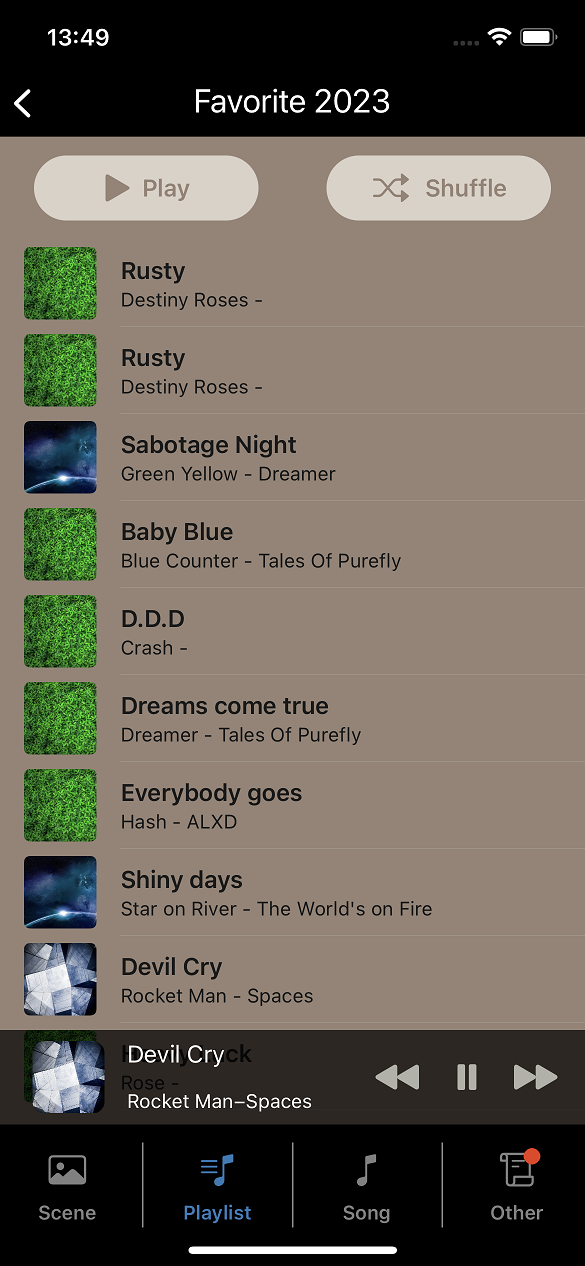 PlayStart playing the songs from beggining of list.ShuffleStart shuffle playback.Song ListSongs in playlist are displayed.The unplayable songs are not displayed. -