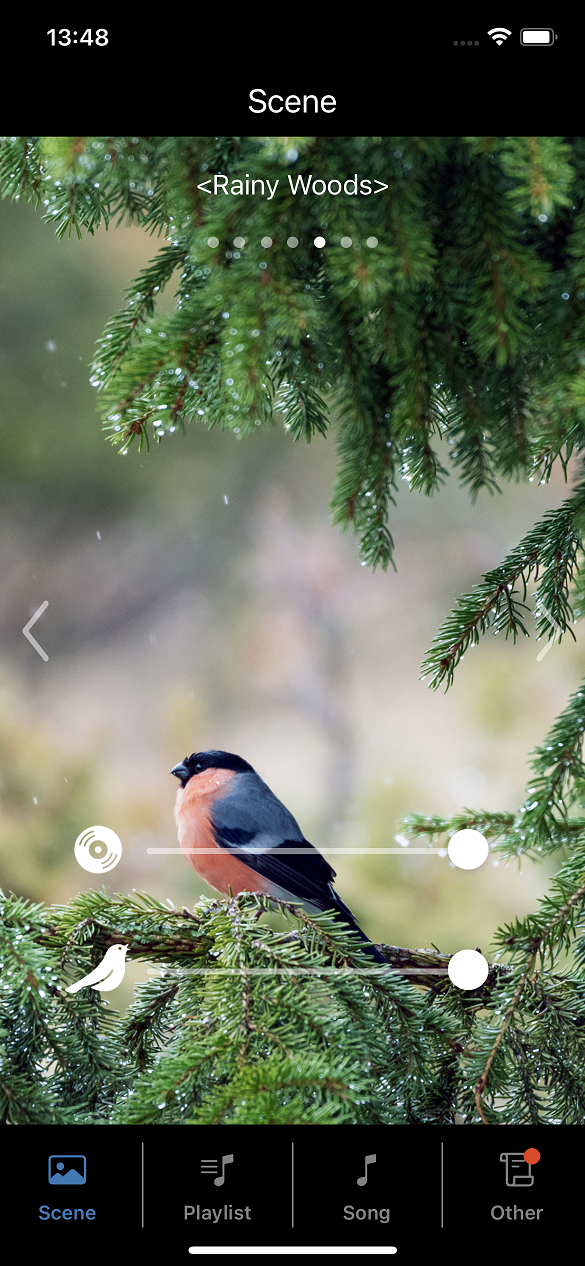You can switch scenes by horizontal swiping the screen. Environmental sounds (BGM) and sound effects are applied according to the selected scene.